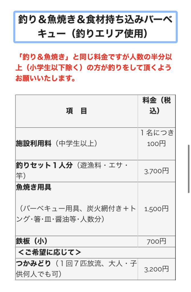 私と妻と小学生の息子の3人で行き、利用料(200円=100円×2人)、釣りセットを1セット(3,700円)、バーベキュー用具(1,500円)で合計5,400円支払いました。