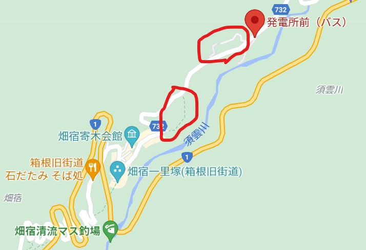 12月訪れた際は、箱根湯本駅からバスに乗車し、釣り場最寄り「畑宿」バス停より少し前の「発電所前」で降りて、旧東海道を歩きました。バーベキュー用の肉と酒が少し重かったですが、簡単なハイキング気分で、なかなか良かったです。GoogleMapで確認できる下記赤丸部分が旧街道で、江戸時代に作られた石畳などがあり、良い感じでした。