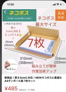 小物の発送におススメなのが、ネコポス用の箱です。メルカリで7枚で送料込み500円弱で購入できます。この箱を使うことで、175円で全国に配達記録付で発送できるネコポスを、最大サイズで利用可能になります。
