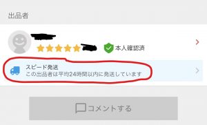 また、メルカリからスピード発送すると下記のような記載が追加されます。買い手からすると、この認定がある出品者に一定の信頼が出ます。